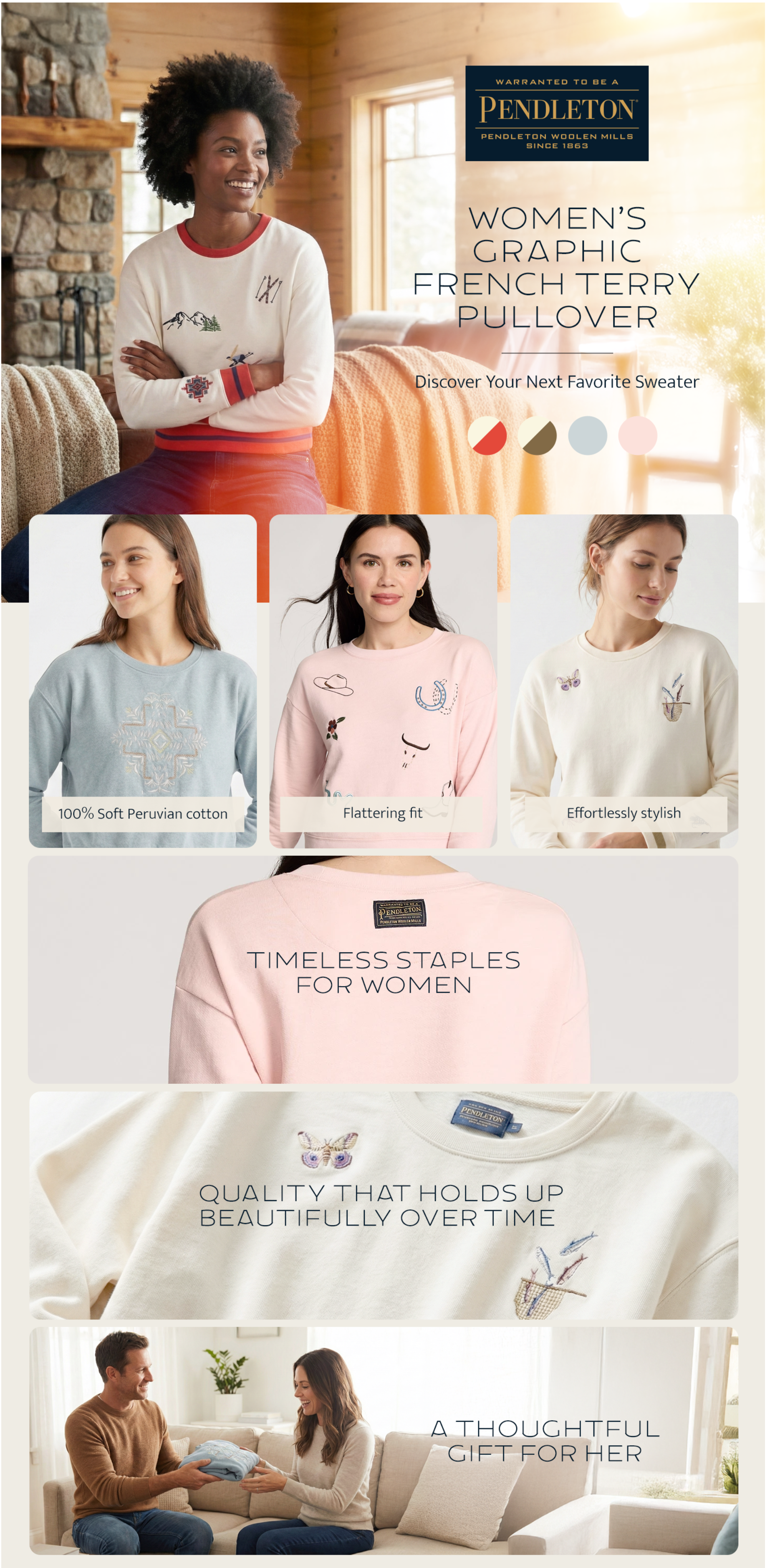 pendleton Women's Embroidered Graphic French Terry Sweater, 100% Cotton, Lightweight, Classic Crewneck